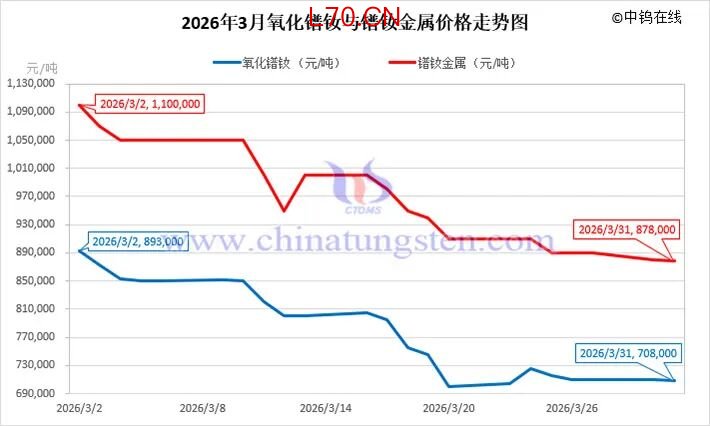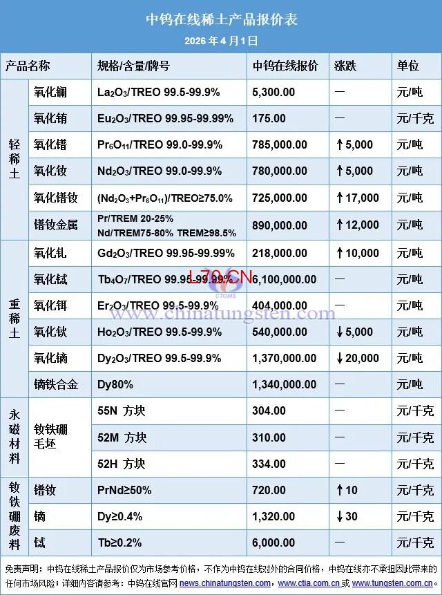 据中钨在线了解,2026年3月中国主流轻重稀土制品价格走势为震荡下降,其中氧化镨价格约降175000元/吨,降幅18.32%;氧化钕价格约降175000元/吨,降幅18.42%;氧化镨钕价格约降185000元/吨,降幅20.72%;镨钕金属价格约降222000元/吨,降幅20.18%;氧化铽价格约降450元/千克,降幅6.87%;氧化镝价格约降250000元/吨,降幅14.72%;镝铁合金价格约降260000元/吨,降幅16.25%。