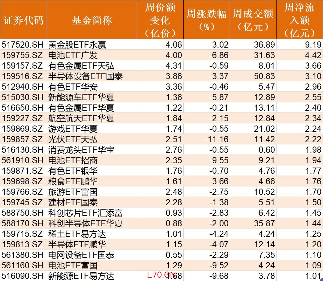 在行业主题ETF方面,本周净流入资金超1亿元的基金有23只,其中黄金股ETF永赢、电池ETF广发、有色金属ETF天弘份额分别增加了4.06亿份、4亿份和4.31亿份,净流入资金9.19亿元、4.42亿元和3.66亿元。
