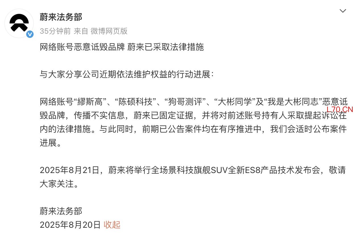 蔚来法务部:网络账号恶意诋毁品牌 已采取法律措施