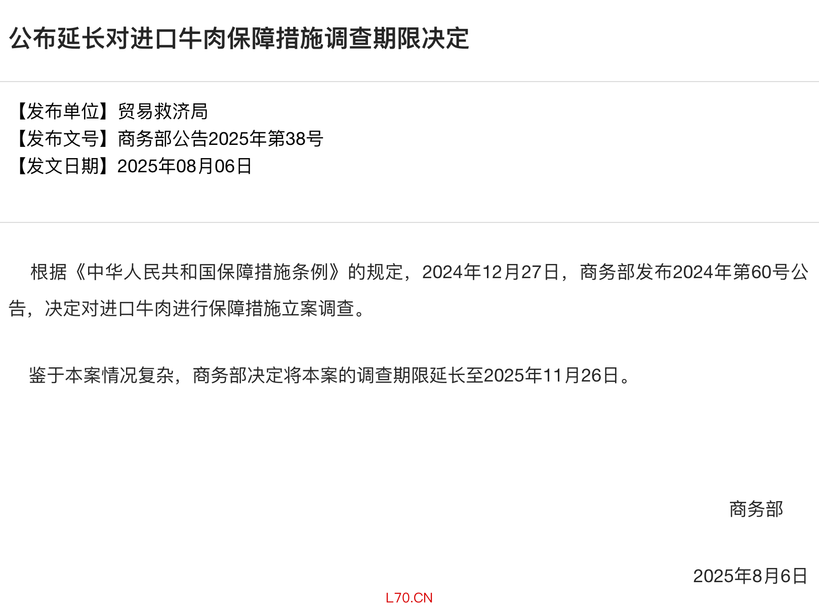 商务部:延长对进口牛肉保障措施调查期限至2025年11月26日