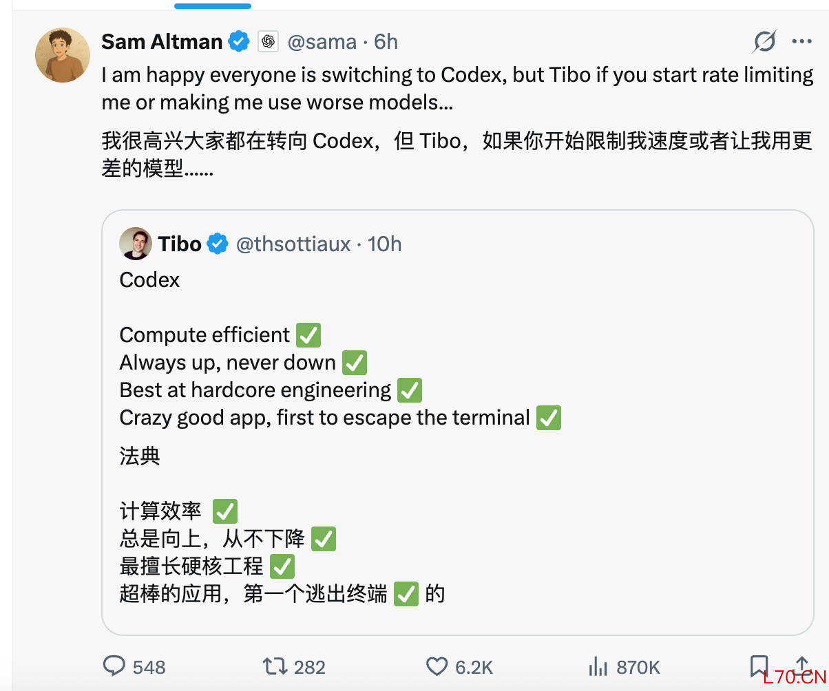 在OpenAI Codex工程负责人Tibo打出“提升计算效率、解决硬核工程”的广告语后,OpenAI CEO山姆·奥尔特曼回应称:很高兴大家都在转向Codex,但如果Tibo你开始限速或提供更差的模型…
