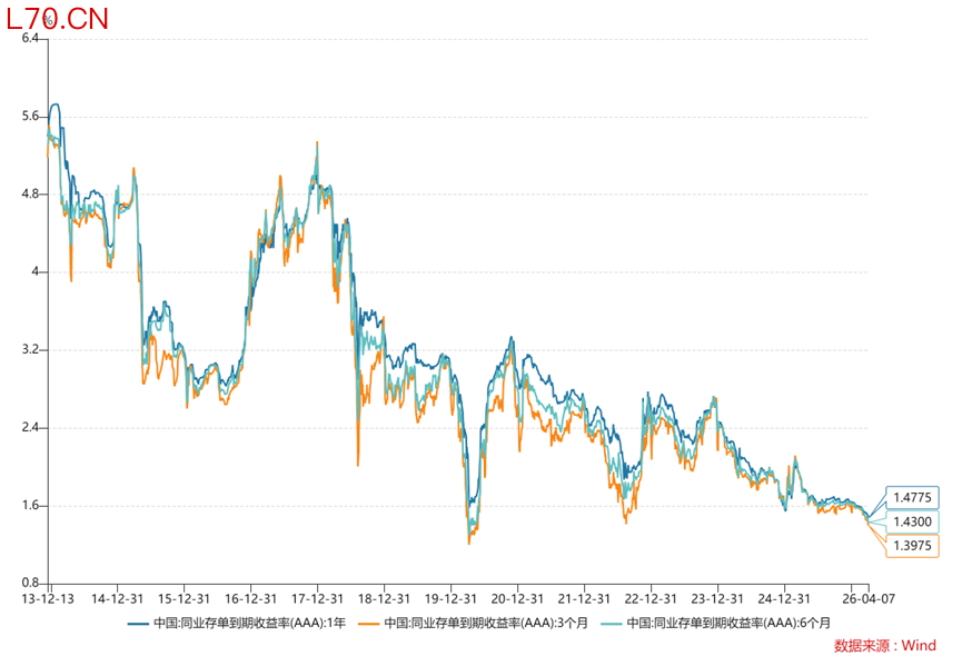 Wind数据显示,4月第一周,AAA级各期限存单二级收益率全线下行,其中1M、6M品种较前周下行4bp,9M品种下行6bp,3M和1Y品种下行5bp,1年期主力品种最终收于1.48%,一级市场发行也同步调降,1年期股份行存单加权发行利率较3月中上旬累计下行超6bp。
