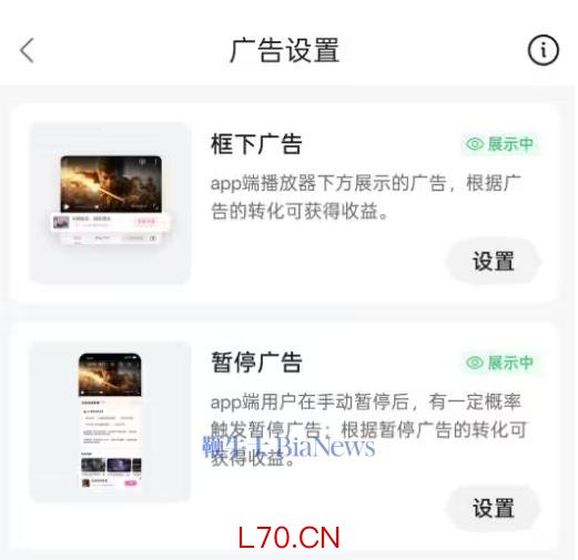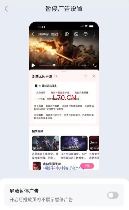 根据网友晒出的设置页面,播放页暂停广告并不是直接覆盖到视频之上,而是在视频下方显示,明确写有“广告”小字,用户可通过点击 X 号关闭。