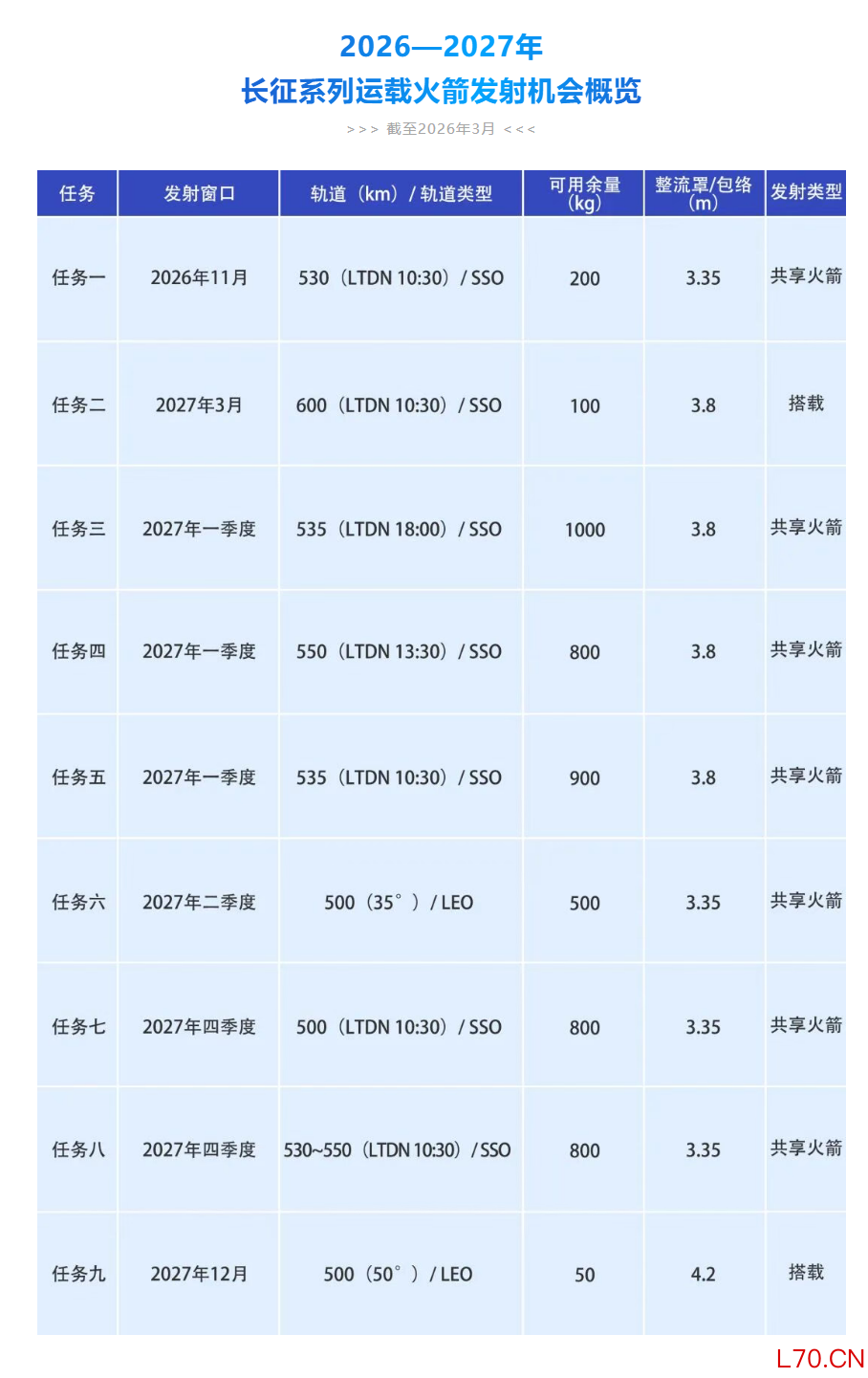 中国商火发布2026—2027年长征系列运载火箭发射机会概览