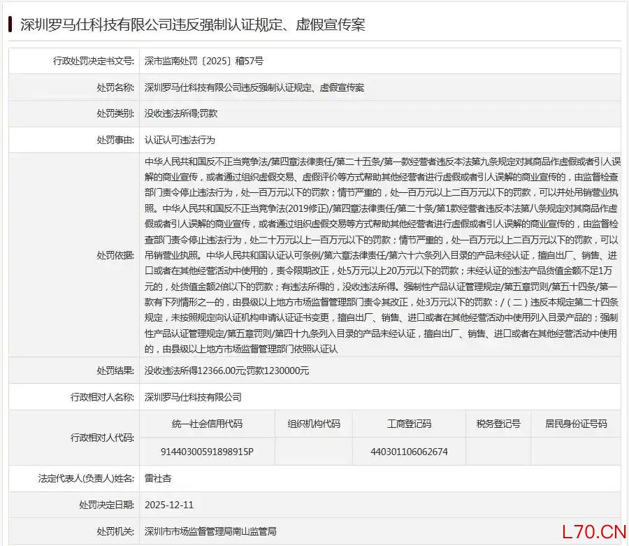 罗马仕被罚123万元