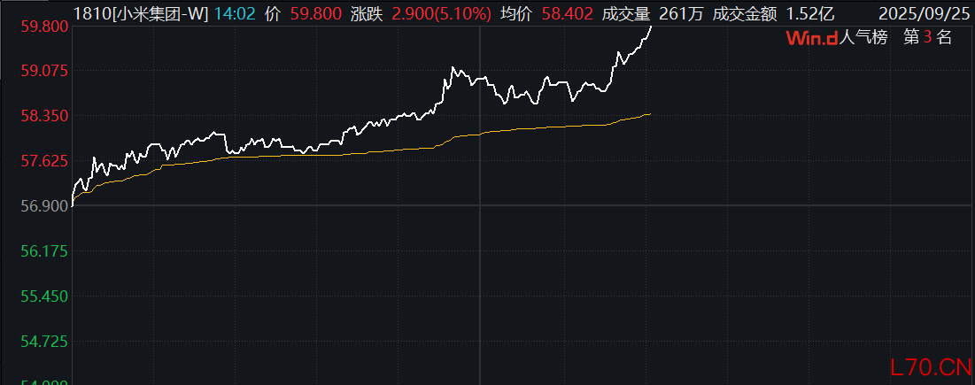港股小米集团涨幅扩大至5%